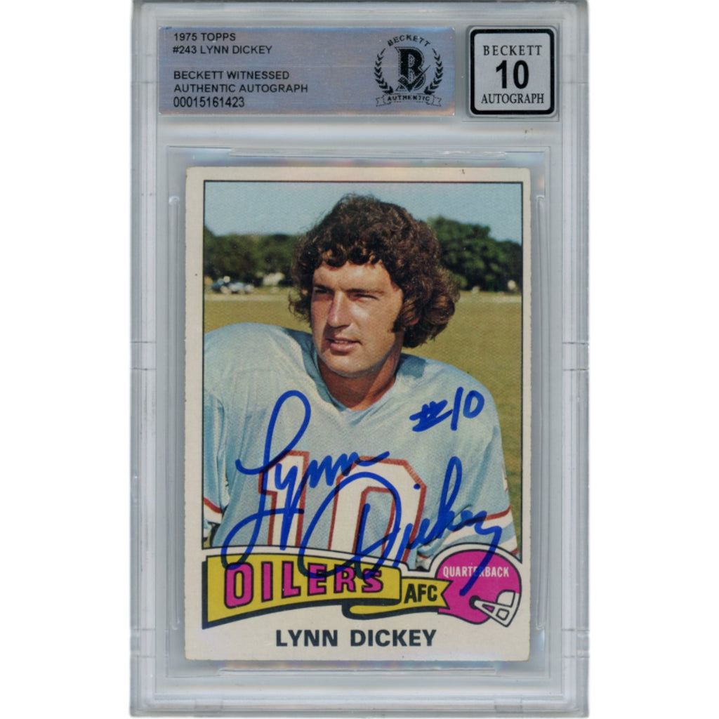The number in the listing title is just an inventory sku for our records and is not the authentication number. The item pictured is the exact item you will receive, please see photos for condition. This is an Houston Oilers 1975 Topps #243 Trading Card that was personally autographed by Lynn Dickey. This has been slabbed by Beckett Authentication Services (BAS) and includes a certificate of authenticity from Denver Autographs.FREE SHIPPING within the USA on orders over $10!