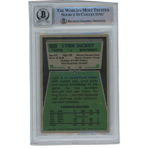 The number in the listing title is just an inventory sku for our records and is not the authentication number. The item pictured is the exact item you will receive, please see photos for condition. This is an Houston Oilers 1975 Topps #243 Trading Card that was personally autographed by Lynn Dickey. This has been slabbed by Beckett Authentication Services (BAS) and includes a certificate of authenticity from Denver Autographs.