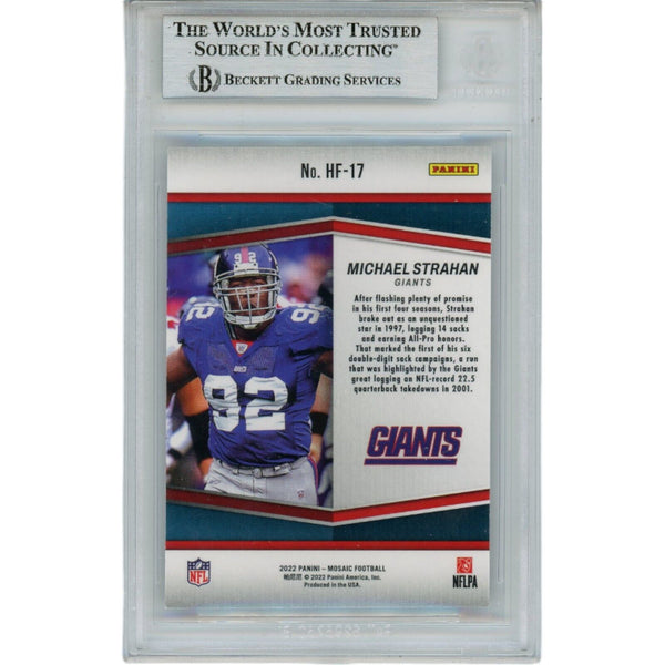 The number in the listing title is just an inventory sku for our records and is not the authentication number. The item pictured is the exact item you will receive, please see photos for condition. This is a New York Giants 2002 Mosaic HF-17 Slabbed Trading Card that was personally autographed by Michael Strahan. Includes a certificate of authenticity from Beckett Authentication Services (BAS) and Denver Autographs.FREE SHIPPING within the USA on orders over $10!