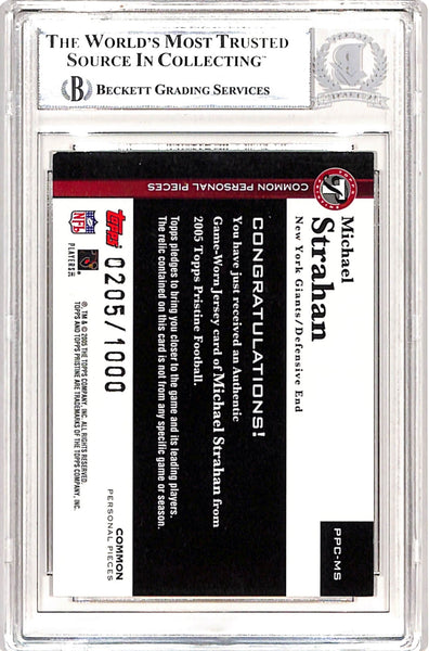 Michael Strahan Signed 2005 Topps #PPC-MS Trading Card Beckett 38978 The number in the listing title is just an inventory sku for our records and is not the authentication number. The item pictured is the exact item you will receive so see photos for condition. This is a slabbed 2005 Topps Pristine #PPC-MS Trading Card that was personally autographed by Michael Strahan. Includes a certificate of authenticity from Beckett Authentication Services (BAS) and Denver Autographs.
