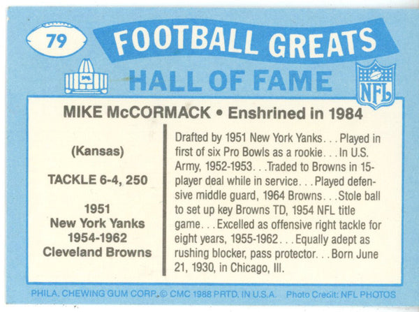 Mike McCormack Autographed/Signed Cleveland Browns 1988 Swell HOF Card 43185 The number in the listing title is just an inventory sku for our records and is not the authentication number. The item pictured is a stock photo unless otherwise noted. This is a 1988 Swell Pro Football Hall Of Fame Anniversary card that has been personally signed by Hall of Famer Mike McCormack. This is the actual card you will receive, please see scan for condition. This item includes a certificate of authenticity from Denver Autographs.