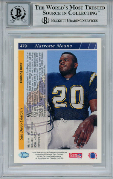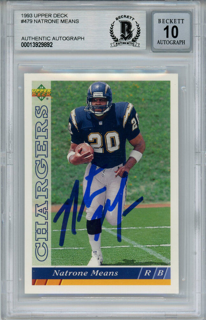 Natrone Means Signed 1993 Upper Deck #479 Rookie Card Beckett 10 Slab 36298 The number in the listing title is just an inventory sku for our records and is not the authentication number. The item pictured is a stock photo unless otherwise noted. This is a trading card that was personally autographed by Natrone Means. This has been professionally slabbed by Beckett Authentication Services (BAS) and includes a certificate of authenticity from Denver Autographs.