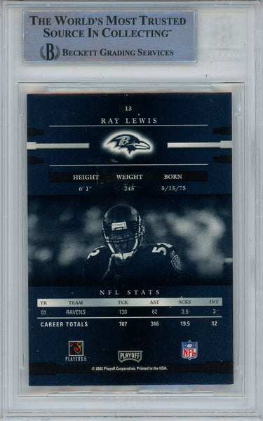 Ray Lewis Autographed 2002 Playoff Prestige #13 Trading Card Beckett Slab 43373 The number in the listing title is just an inventory sku for our records and is not the authentication number. The item pictured is a stock photo unless otherwise noted. This is a trading card that was personally autographed by Ray Lewis. This has been professionally slabbed by Beckett Authentication Services (BAS) and includes a certificate of authenticity from Denver Autographs.