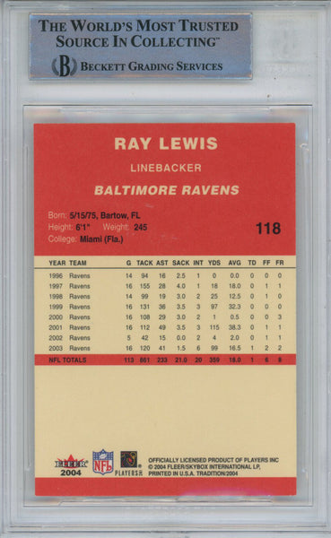 Ray Lewis Autographed 2004 Fleer Tradition #118 Trading Card Beckett Slab 43359 The number in the listing title is just an inventory sku for our records and is not the authentication number. The item pictured is a stock photo unless otherwise noted. This is a trading card that was personally autographed by Ray Lewis. This has been professionally slabbed by Beckett Authentication Services (BAS) and includes a certificate of authenticity from Denver Autographs.