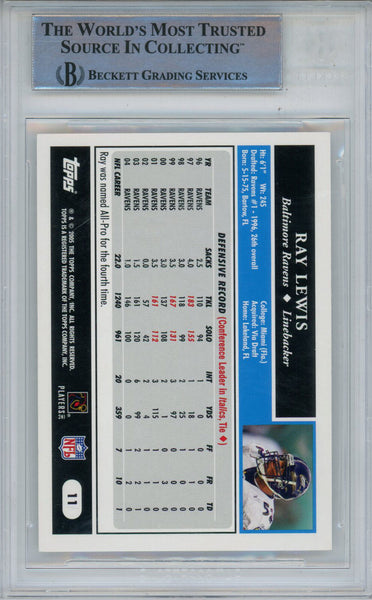 Ray Lewis Autographed 2005 Topps #11 Trading Card Beckett Slab 43385 The number in the listing title is just an inventory sku for our records and is not the authentication number. The item pictured is a stock photo unless otherwise noted. This is a trading card that was personally autographed by Ray Lewis. This has been professionally slabbed by Beckett Authentication Services (BAS) and includes a certificate of authenticity from Denver Autographs.