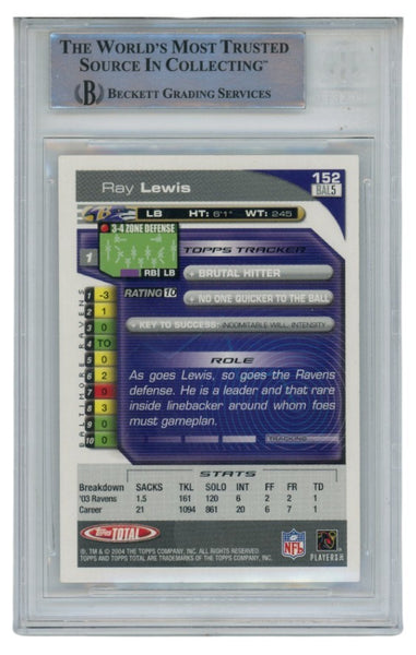 The number in the listing title is just an inventory sku for our records and is not the authentication number. The item pictured is the exact image you will receive, please see photos for condition. This is a Baltimore Ravens 2004 Topps #152 Slabbed Trading Card that was personally autographed by Ray Lewis. Includes a certificate of authenticity from Beckett Authentication Services (BAS) and Denver Autographs. FREE SHIPPING within the USA on orders over $10!