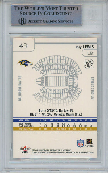Ray Lewis Signed 2003 Fleer Authentix #49 Trading Card Beckett Slab 43363 The number in the listing title is just an inventory sku for our records and is not the authentication number. The item pictured is a stock photo unless otherwise noted. This is a trading card that was personally autographed by Ray Lewis. This has been professionally slabbed by Beckett Authentication Services (BAS) and includes a certificate of authenticity from Denver Autographs.