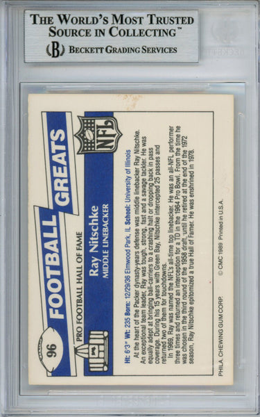 Ray Nitschke Autographed 1989 Swell #89 Trading Card Beckett Slab 37487 The number in the listing title is just an inventory sku for our records and is not the authentication number. The item pictured is a stock photo unless otherwise noted. This is a trading card that was personally autographed by Ray Nitschke. This has been professionally slabbed by Beckett Authentication Services (BAS) and includes a certificate of authenticity from Denver Autographs.