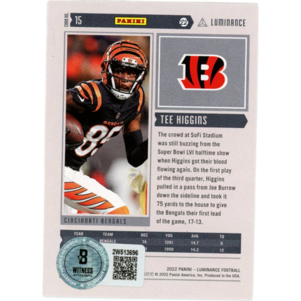 The number in the listing title is just an inventory sku for our records and is not the authentication number. The item pictured is the exact item you will receive, please see photos for condition. This is a Panini Luminance #15 2022 Trading Card that was personally autographed by Tee Higgins. Includes a certificate of authenticity from Beckett Authentication Services (BAS) and Denver Autographs.FREE SHIPPING within the USA on orders over $10!