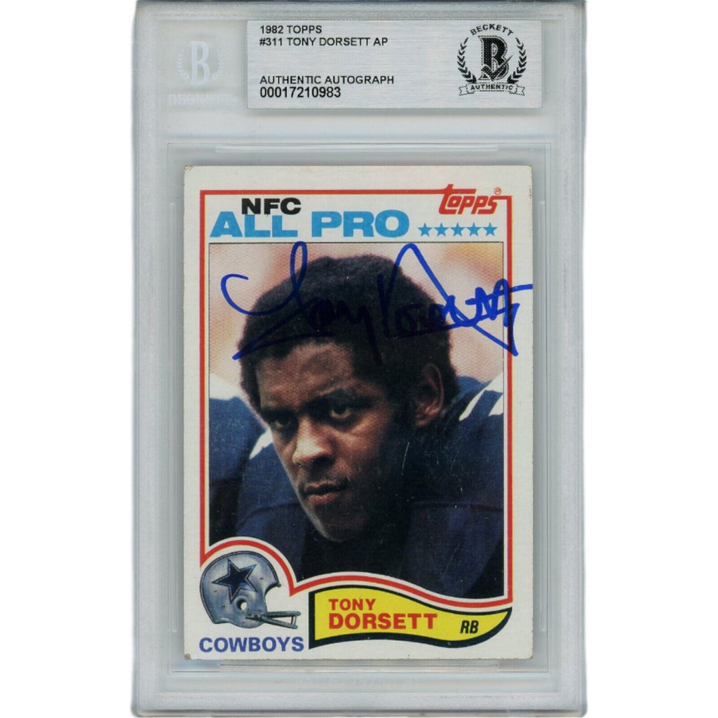 The number in the listing title is just an inventory sku for our records and is not the authentication number. The item pictured is the exact item you will receive, please see photos for condition. This is a Dallas Cowboys 1982 Topps 311 Slabbed Trading Card that was personally autographed by Tony Dorsett. Includes a certificate of authenticity from Beckett Authentication Services (BAS) and Denver Autographs.FREE SHIPPING within the USA on orders over $10!
