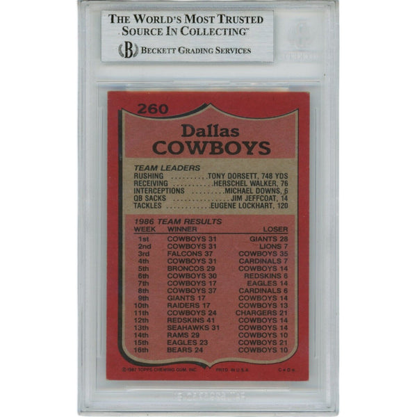 The number in the listing title is just an inventory sku for our records and is not the authentication number. The item pictured is the exact item you will receive, please see photos for condition. This is a Dallas Cowboys 1987 Topps 260 Slabbed Trading Card that was personally autographed by Tony Dorsett. Includes a certificate of authenticity from Beckett Authentication Services (BAS) and Denver Autographs.FREE SHIPPING within the USA on orders over $10!