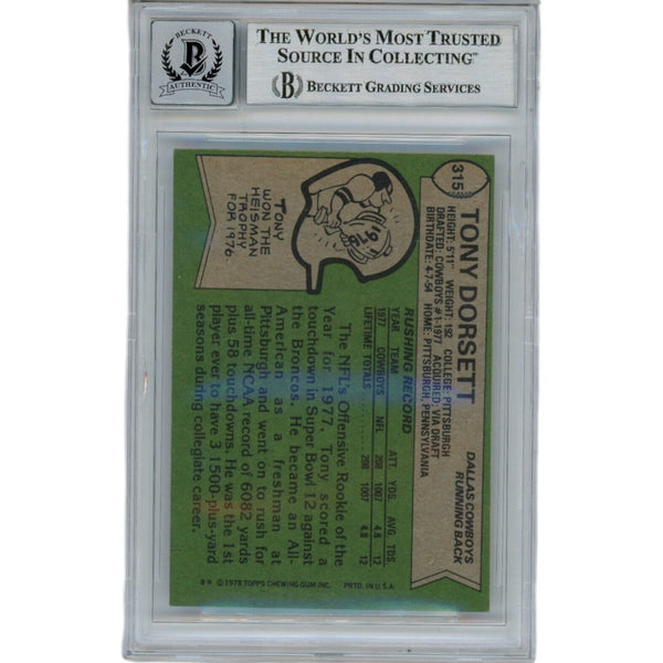 The number in the listing title is just an inventory sku for our records and is not the authentication number. The item pictured is the exact item you will receive, please see photos for condition. This is a Dallas Cowboys 1978 Topps 315 Slabbed Grade 10 Trading Card that was personally autographed by Tony Dorsett includes two inscriptions: "ROY '77" and "HOF '94". Includes a certificate of authenticity from Beckett Authentication Services (BAS) and Denver Autographs.FREE SHIPPING within the USA on orders over $10!