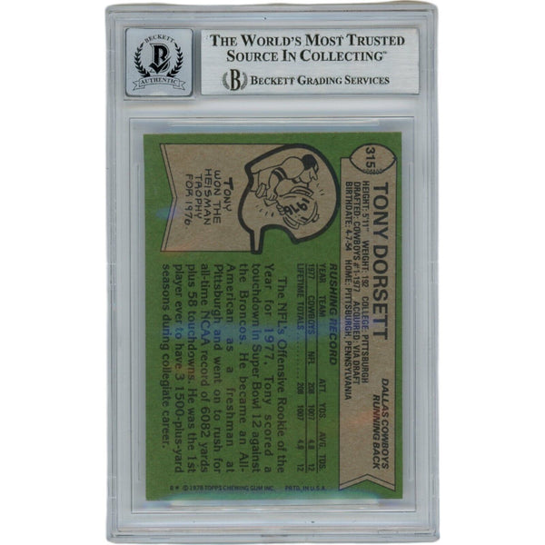 The number in the listing title is just an inventory sku for our records and is not the authentication number. The item pictured is the exact item you will receive, please see photos for condition. This is a Dallas Cowboys 1978 Topps 315 Slabbed Grade 10 Trading Card that was personally autographed by Tony Dorsett includes two inscriptions: "ROY '77" and "HOF '94". Includes a certificate of authenticity from Beckett Authentication Services (BAS) and Denver Autographs.FREE SHIPPING within the USA on orders over $10!