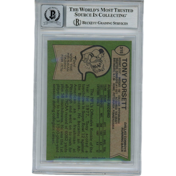 The number in the listing title is just an inventory sku for our records and is not the authentication number. The item pictured is the exact item you will receive, please see photos for condition. This is a Dallas Cowboys 1978 Topps 315 Slabbed Grade 10 Trading Card that was personally autographed by Tony Dorsett includes two inscriptions: "ROY '77" and "HOF '94". Includes a certificate of authenticity from Beckett Authentication Services (BAS) and Denver Autographs.FREE SHIPPING within the USA on orders over $10!