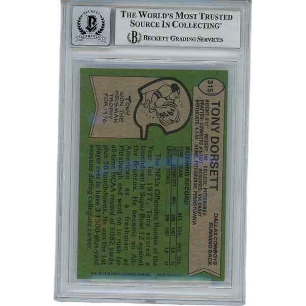 The number in the listing title is just an inventory sku for our records and is not the authentication number. The item pictured is the exact item you will receive, please see photos for condition. This is a Dallas Cowboys 1978 Topps 315 Slabbed Grade 10 Trading Card that was personally autographed by Tony Dorsett includes two inscriptions: "ROY '77" and "HOF '94". Includes a certificate of authenticity from Beckett Authentication Services (BAS) and Denver Autographs.FREE SHIPPING within the USA on orders over $10!