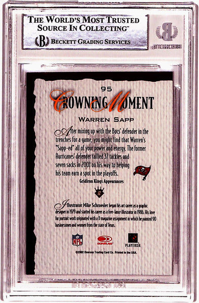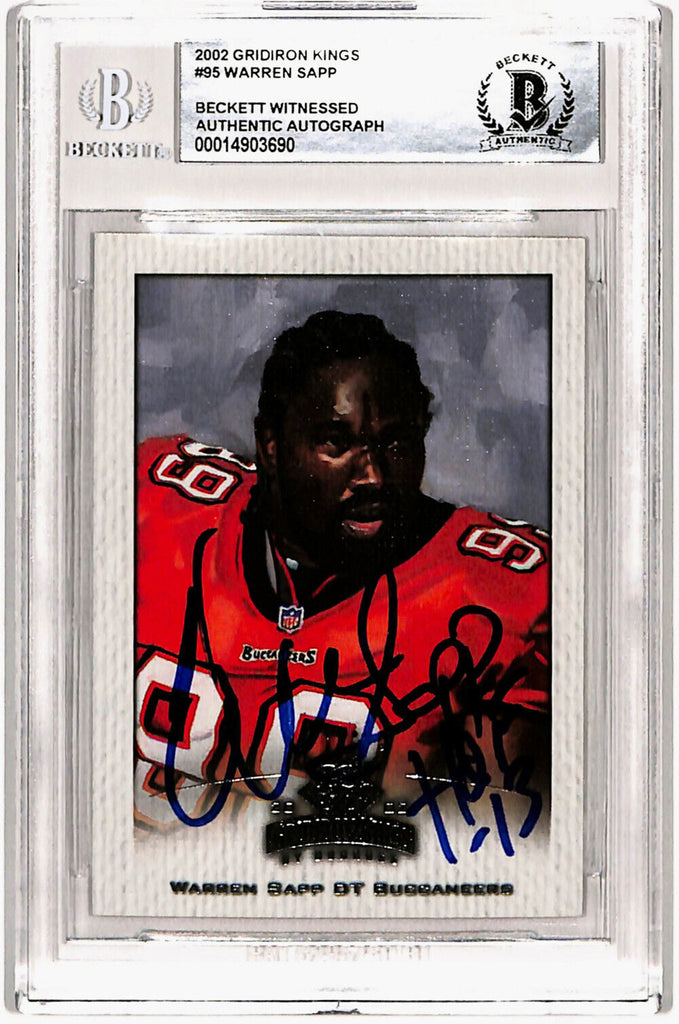 Warren Sapp Autographed 2002 Gridiron Kings #95 Trading Card Beckett Slab 40745 The number in the listing title is just an inventory sku for our records and is not the authentication number. The item pictured is a stock photo unless otherwise noted. This is a trading card that was personally autographed by Warren Sapp. This has been professional slabbed by Beckett Authentication Services (BAS) and includes a certificate of authenticity from Denver Autographs.