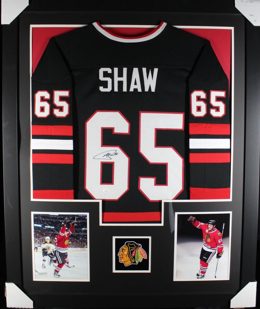 ANDREW SHAW AUTOGRAPHED & PROFESSIONALLY FRAMED PRO-STYLE JERSEY(Occasionally our own stock pictures are used at times due to quantity of framing, all frames will look identical as the one pictured)THE FRAMED JERSEY MEASURES 35"x 44" & COMES WITH THE FOLLOWING:-UV Protected Acrylic-Triple Acid Free Team Colored Matting-2 High Quality 8"x10" Photos-Team LogoEvery framed autographed jersey is accompanied with a tamper-proof hologram on the signed part of the jersey from one of the main authenticators in the industry (JSA, Beckett, PSA, etc.) and can be verified on their corresponding websites to prove authenticity.ATTENTION:If there's any damage during shipping then please message us immediately and save the box!DO NOT OPEN A RETURN OR DISPUTE PLEASE!We will provide a return label to send the frame back so we can fix any issues right away and ship it right back to you, free of charge of course!WE DO NOT OFFER PARTIAL REFUNDS TO FIX LOCALLY AS EVERYTHING IS FRAMED/FIXED IN HOUSE- Thank you -
