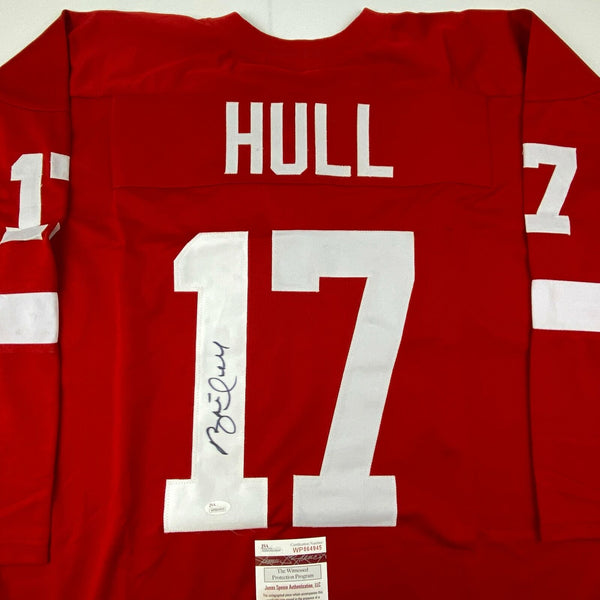 Autographed/Signed Brett Hull Detroit Red Hockey Jersey JSA COA Auto Jersey has no brand names or logos. This is a custom jersey and was not manufactured by or in any manner associated with any professional sports league or manufacturer. This custom jersey carries no professional sports league designation. The item is intended to be an autographed collectible. The custom jersey displays the name and number of the player. This item in no way is affiliated with or connected to any professional sports organization. Size is XL.