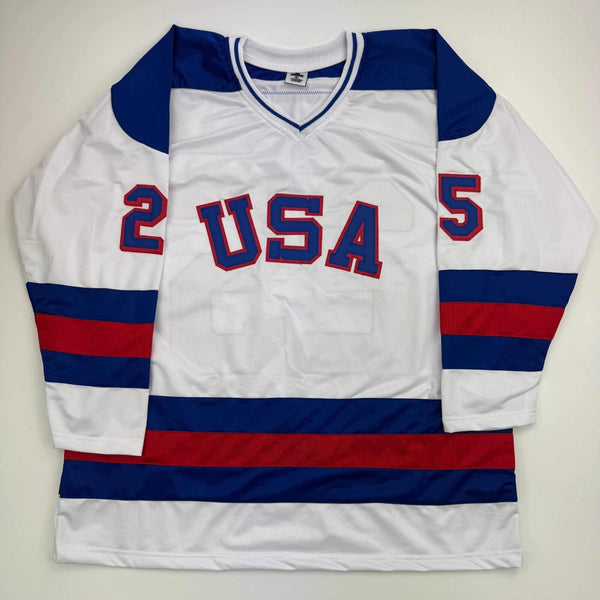 Autographed/Signed Buzz Schneider White USA Miracle On Ice 1980 Jersey BAS COA Jersey has no brand names or logos. This is a custom jersey and was not manufactured by or in any manner associated with any professional sports league or manufacturer. This custom jersey carries no professional sports league designation. The item is intended to be an autographed collectible. The custom jersey displays the name and number of the player. This item in no way is affiliated with or connected to any professional sports organization. Size is XL.