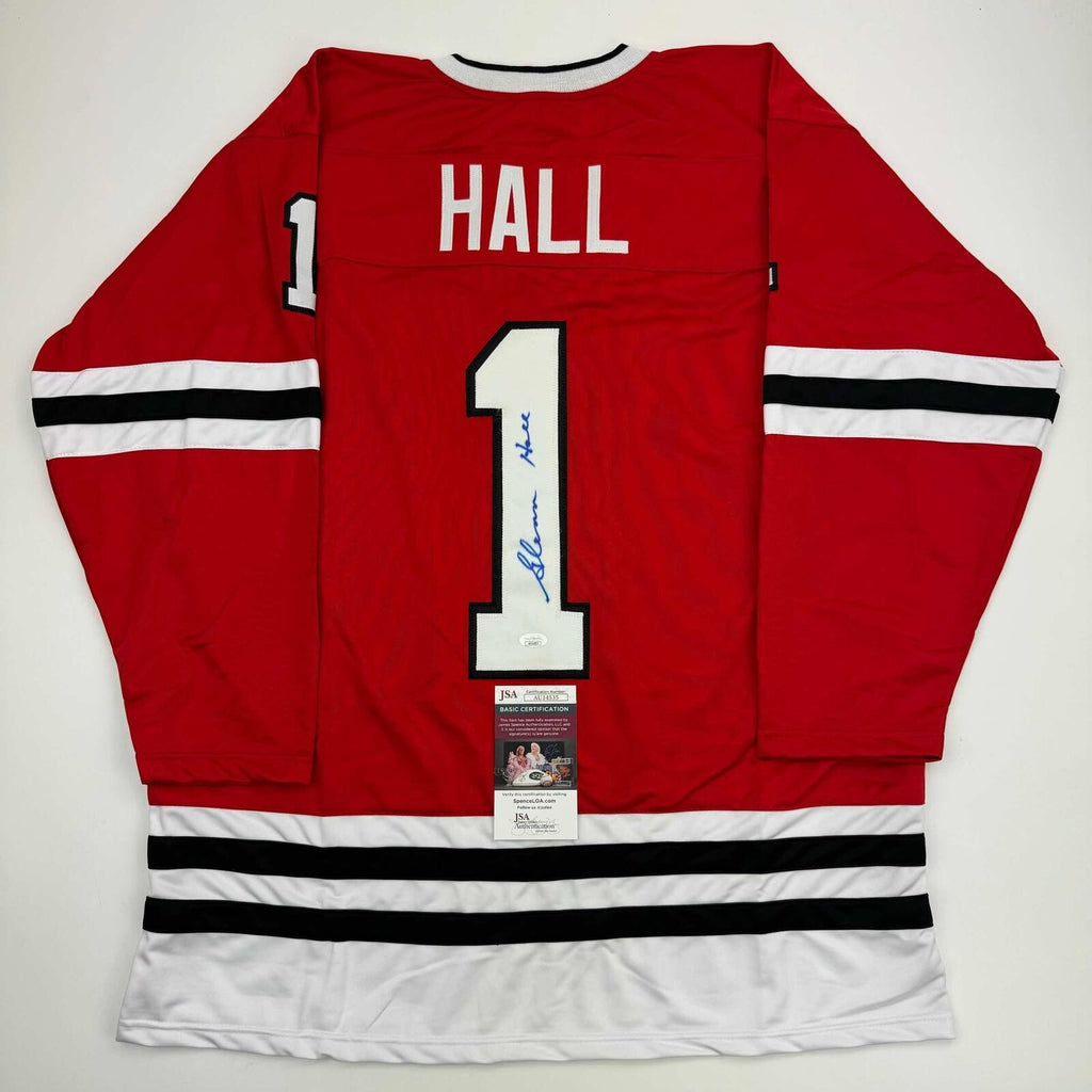 Autographed/Signed Glenn Hall Chicago Red Hockey Jersey JSA COA Jersey has no brand names or logos. This is a custom jersey and was not manufactured by or in any manner associated with any professional sports league or manufacturer. This custom jersey carries no professional sports league designation. The item is intended to be an autographed collectible. The custom jersey displays the name and number of the player. This item in no way is affiliated with or connected to any professional sports organization. Size is XL.