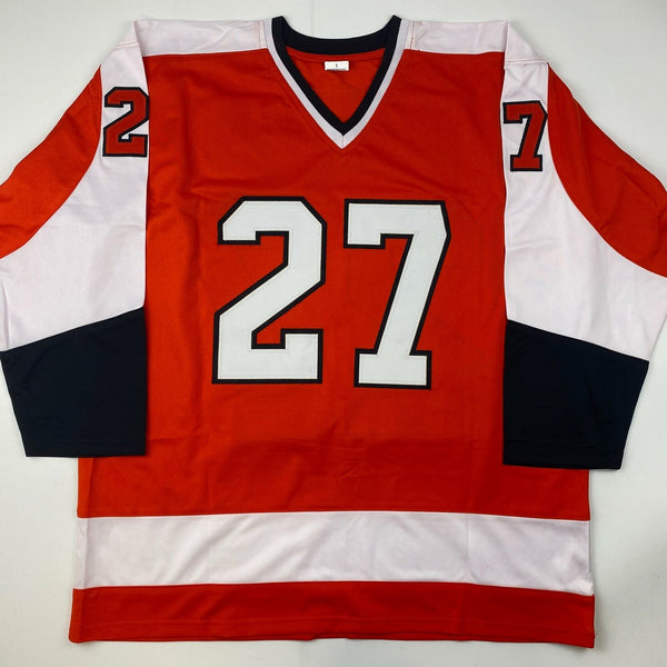 Autographed/Signed Reggie Leach Philadelphia Orange Hockey Jersey JSA COA Jersey has no brand names or logos. This is a custom jersey and was not manufactured by or in any manner associated with any professional sports league or manufacturer. This custom jersey carries no professional sports league designation. The item is intended to be an autographed collectible. The custom jersey displays the name and number of the player. This item in no way is affiliated with or connected to any professional sports organization. Size is XL.