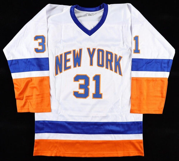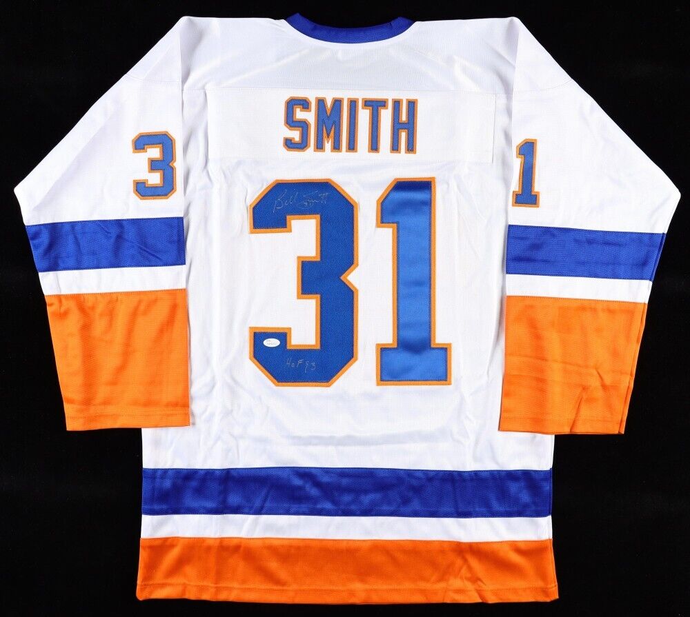 This autographed Adult XL custom on-ice style jersey has been personally hand-signed by Billy Smith of the New York Islanders. The autograph(s) includes an official James Spence Authentication (JSA) hologram and matching COA for authenticity purposes. The signing of this item was witnessed by JSA.Authentication: JSA COASmith played in the 1978 All-Star Game, where he was named MVP. For the rest of the decade, he shared time in the Islanders net with Chico Resch, where they combined to form perhaps the top goaltending duo in the NHL at the time. This changed in the 1980 playoffs, when the Isles rode Smith's goaltending to their first of four consecutive Stanley Cups, firmly establishing Smith as the team's starting goaltender. Resch was dealt to the Colorado Rockies the following season. Smith went on to become a First Team All-Star and Vezina Trophy winner in 1982. In 1983, he won the William Jennings Trophy for fewest goals allowed (shared with Roland Melanson). He was chosen to play for Canada in the 1981 Canada Cup but was unable to play due to an injury sustained in a pre-tournament game.Smith's regular season success, however, was surpassed by his performances in the playoffs, as he helped the Islanders win four straight Stanley Cups (1980-83), reach the finals five straight times (1980-84), and win a record 19 consecutive playoff series from 1980-84.