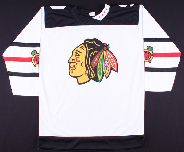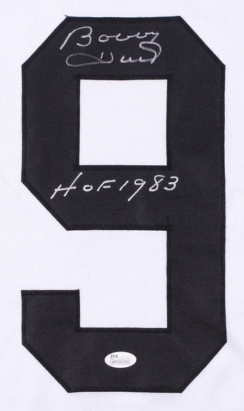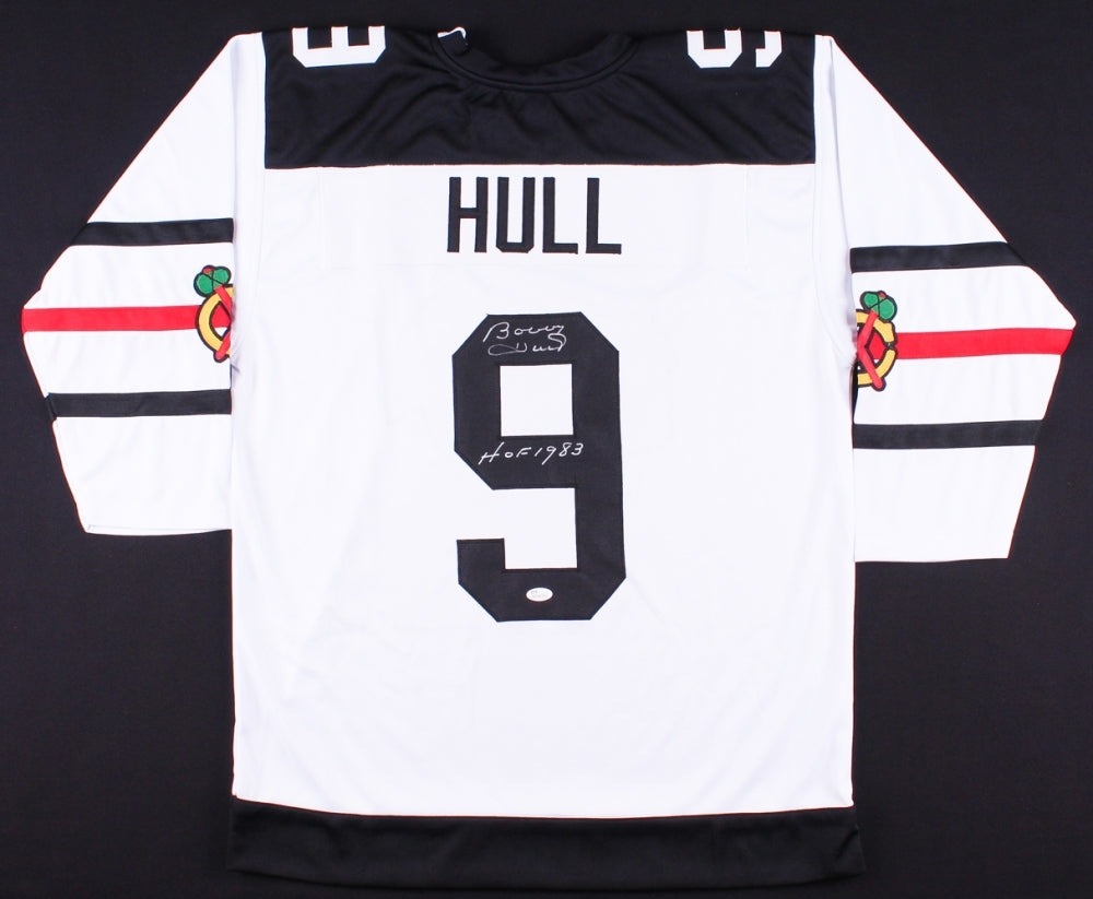 Custom on-ice style jersey. Everything sewn on, size XL. Hand-signed and inscribed in silver paint pen by Bobby Hull (Blackhawks HOF). The autograph includes an official James Spence Authentication (JSA) hologram and matching COA for authenticity purposes. The signing of this item was witnessed by JSA.Authentication: JSA COA