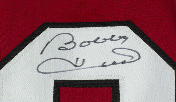 Featured is a Bobby Hull signed custom red hockey jersey in which he added the "HOF 1983" inscription. This jersey was hand signed by Bobby Hull and authenticated by JSA authentication services. Included with the jersey is a JSA hologram and certificate of authentication. This item would make a great addition to any sports memorabilia collection! SPECIFICATIONS Autographed By: Bobby Hull Team: Chicago Blackhawks Sport: Hockey Authentication: James Spence Authentication (JSA)