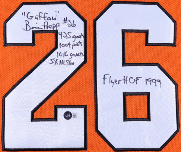 CCM on-ice style jersey. Everything is sewn on, size 50. Hand-signed twice (Front & Back) by Brian Propp (Philadelphia Flyers).Propp was known for his unique goal celebration dubbed "The Guffaw". After scoring a goal, Propp would skate towards center ice, place his right glove under his left arm and raise his right arm in a waving fashion. While making the gesture, Propp would say, "Guffaw!" Propp credits the celebration to comedian Howie Mandel.During an Atlantic City show in 1986, Mandel used the Guffaw during his comedic routine. Mandel explained a Guffaw was when someone raised their arm and moved it back and forth. Propp adopted "The Guffaw" and it became his signature move, first appearing in the 1986-87 season.The autograph includes an official Beckett Authentication Services serially numbered scannable hologram and QR Code card for authenticity purposes.Authentication: Beckett Scannable Hologram with QR Code card