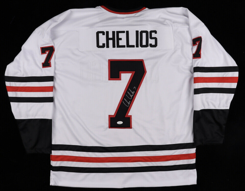 Custom on-ice style jersey. Everything sewn on, size XL. Hand-signed in black felt-tip pen by Chris Chelios (HOF). The lot / autograph(s) includes an official James Spence Authentication (JSA) hologram and matching COA for authenticity purposes. The signing of this item was witnessed by JSA.Authentication: JSA COA