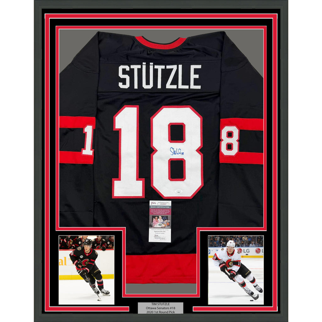 Framed Autographed/Signed Tim Stutzle 35x39 Ottawa Black Hockey Jersey JSA COA The item is professionally framed and matted with two 5x7 photos, measures 35x39 inches and is ready to be hung in your man cave! Photo and matting requests can be made.