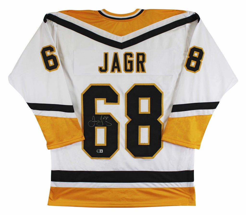 This Autographed White Pro Style Jersey has been Personally Signed by Jaromir Jagr of the Pittsburgh Peguins. This item is 100% Authentic to include a hologram by Beckett Authentication Services. This item will come with an affixed Beckett Authentication Services (BAS) authentication sticker, which includes a scannable QR code to verify authenticity. Please note that Beckett no longer provides serial-numbered COA cards, and the attached BAS sticker will serve as the complete authentication for this item. This is a BAS Witnessed Protection Program item which means a Beckett Authentication Service representative was present when this item was being signed. We conducted an autograph signing with Jaromir Jagr where multiples of the same item were signed. While the photographs are representative of this item, the size, placement and strength of the signature may vary. Each item is hand signed, therefore, each autograph is unique. This item can be verified through BAS Witnessed. This is a X-Large sized, non-branded, custom-stitched Jersey.