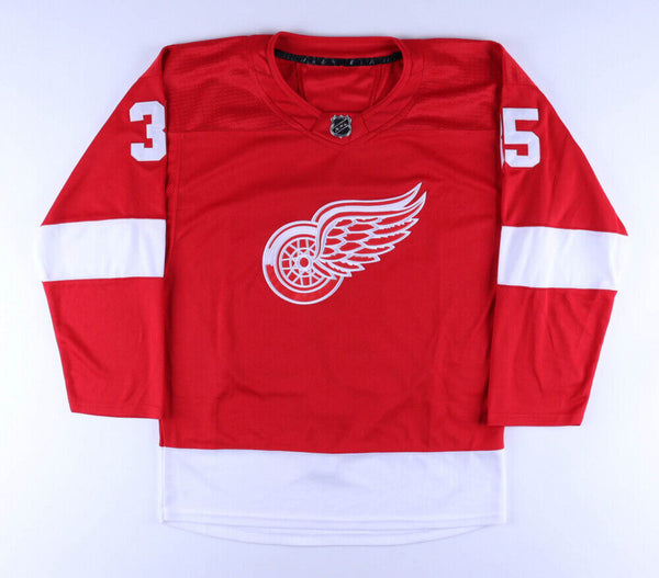 Custom on-ice style jersey. Everything is sewn on, size XL. Hand-signed in blue felt-tip pen by Jimmy Howard. The lot / autograph(s) includes an official Beckett Authentication Services serially numbered hologram and matching COA for authenticity purposes.Authentication: Beckett COA