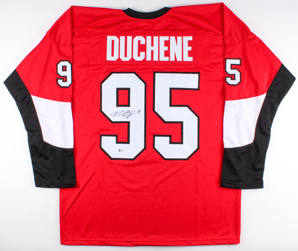Custom on-ice style jersey. Everything sewn on, size XL. Hand-signed in black felt-tip pen by Matt Duchene. The autograph includes an official Beckett Authentication Services serially numbered hologram and matching COA for authenticity purposes.Authentication: Beckett COA