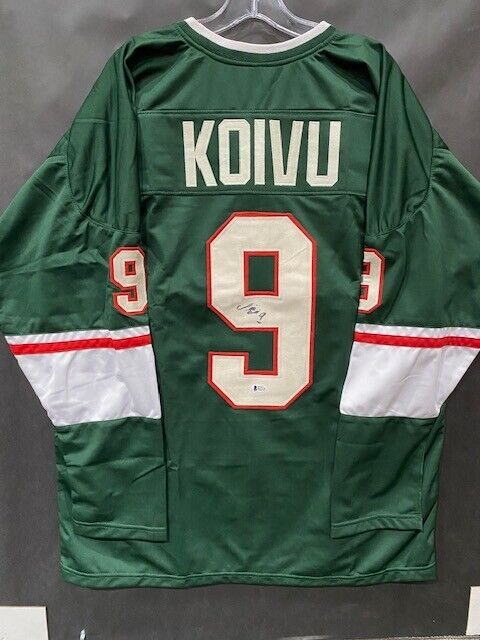Custom on-ice style jersey. Everything is sewn on, size XL. Hand-signed in black felt tip pen by Mikko Koivu. The autograph includes an official Beckett Authentication Services serially numbered hologram and matching COA for authenticity purposes.Authentication: Beckett COA