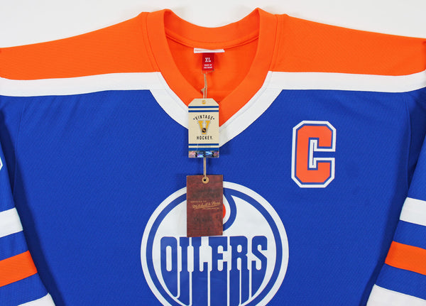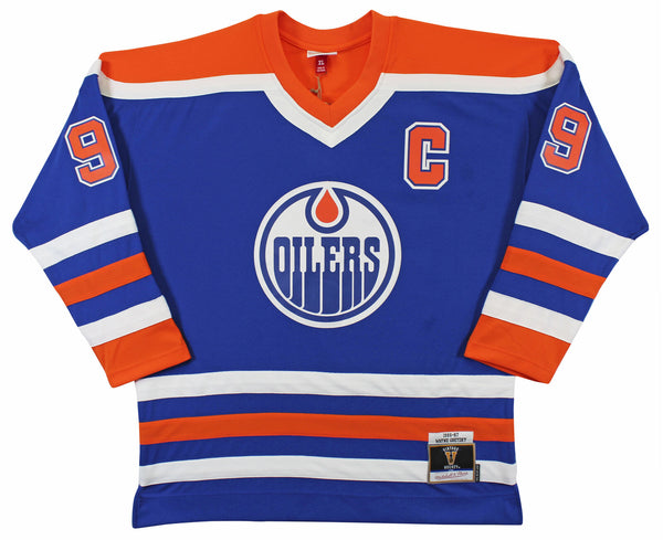 This Autographed Blue 1986-87 Vintage Hockey Mitchell & Ness NHL Blue Line Jersey has been Personally Signed by Wayne Gretzky of the Edmonton Oilers. This item is 100% Authentic to include a Certificate of Authenticity (COA) / hologram by Beckett Authentication Services. The authenticity can be verified on Beckett Authentication Services website. This is a X-Large sized Jersey.