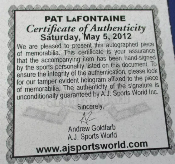 Fanatics NHL jersey. Everything is sewn on, size 2XL. Hand-signed by Pat LaFontaine (New York Islanders, Buffalo Sabres, New York Rangers, HOF 2003).The lot / autograph(s) includes an official AJ's Sports World hologram and matching COA for authenticity purposes.Authentication: AJ's Sports World COA