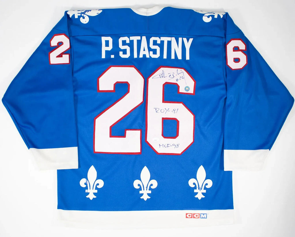 This autographed CCM jersey has been personally hand-signed by Peter Stastny ("ROY 81 HOF 98" inscription) of the Quebec Nordiques.This autograph is certified by James Spence Authentication (JSA). It comes with the numbered hologram and matching Certificate of Authenticity. Check out all the items in our Friendly Confines Collectibles store, Thanks for looking.