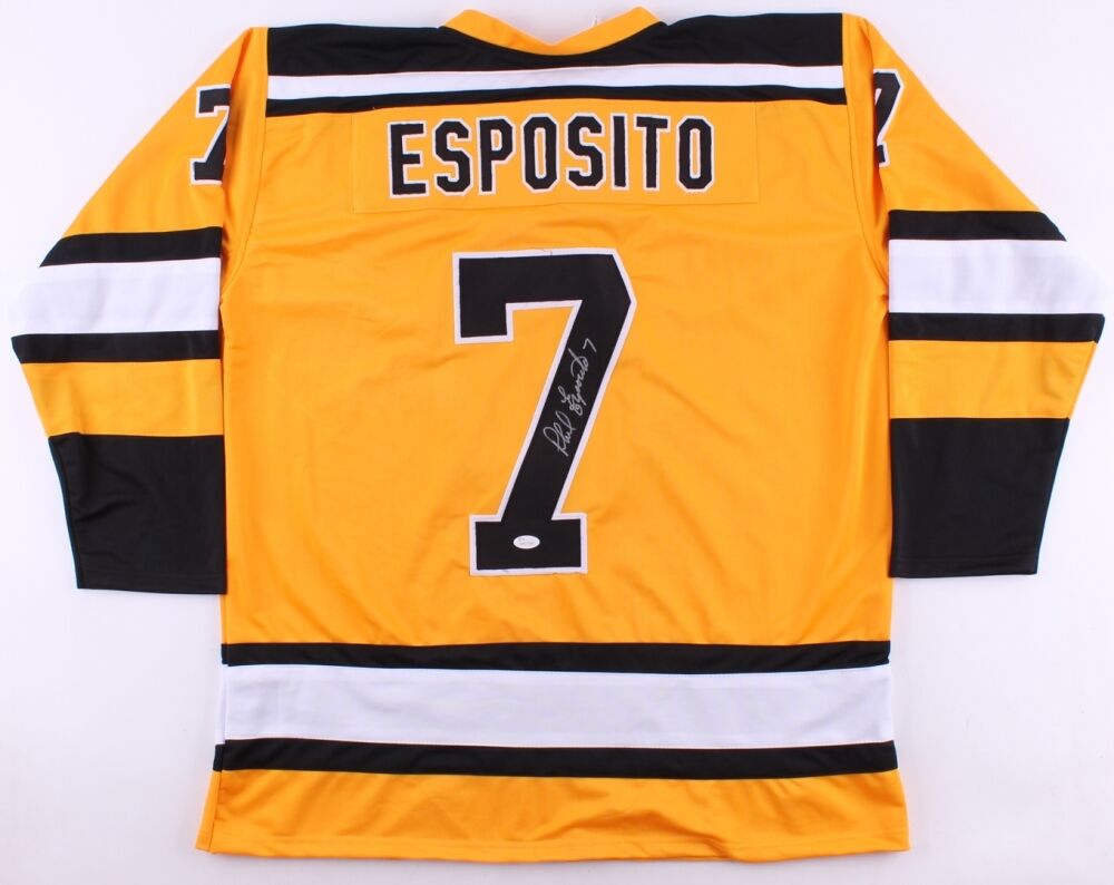 Custom on-ice style jersey. Everything is sewn on, size XL. Hand-signed in black felt-tip pen by Phil Esposito. (Chicago Blackhawks, Boston Bruins, New York Rangers, HOF) The lot / autograph(s) includes an official James Spence Authentication (JSA) hologram and matching COA for authenticity purposes. The signing of this item was witnessed by JSA.Authentication: JSA COA