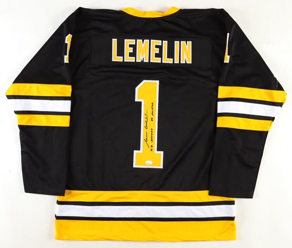 Custom on-ice style jersey. Everything is sewn on, size XL. Hand-signed in black felt-tip pen by Reggie Lemelin. The lot / autograph(s) includes an official James Spence Authentication (JSA) hologram and QR Code card for authenticity purposes. The signing of this item was witnessed by JSA.Authentication: JSA Hologram & QR Code card