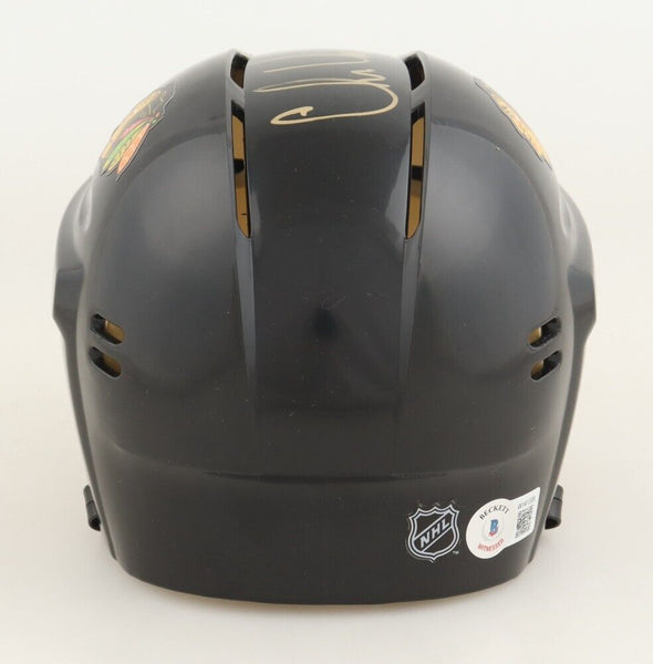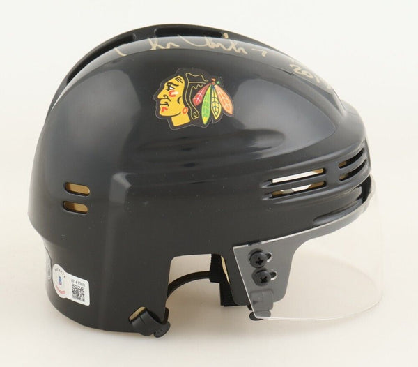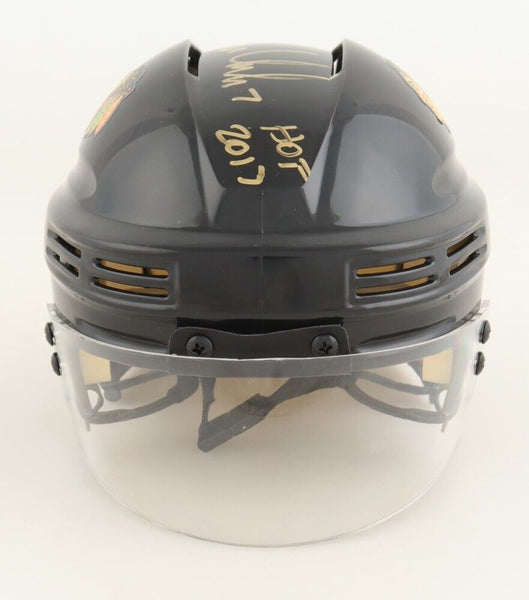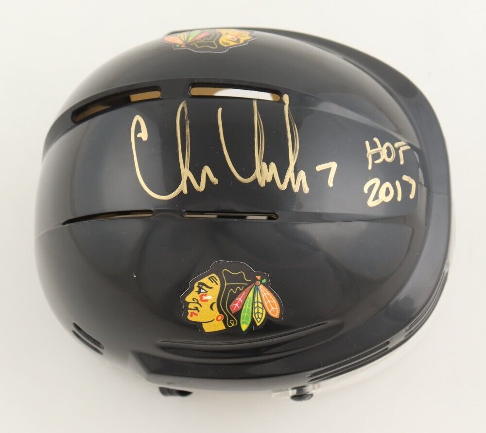 Chicago Blackhawks mini helmet has been hand-signed and inscribed by Chris Chelios (HOF).The autograph includes an official Beckett Authentication Services serially numbered hologram for authenticity purposes. The signing of this item was witnessed by Beckett.Authentication: Beckett Hologram
