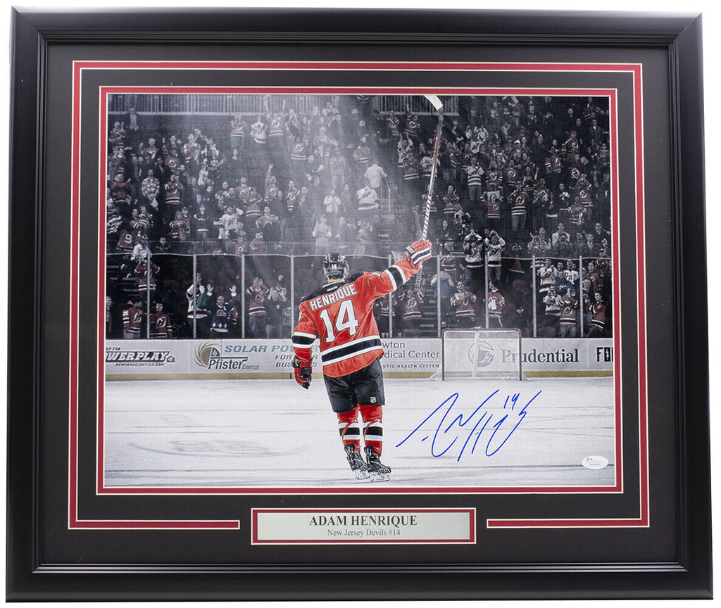 Featured is an Adam Henrique signed framed 16x20 New Jersey Devils photo. This photo was hand signed by Adam Henrique and has been authenticated by JSA authentication services. Included with the photo is a JSA hologram. Brand new professional framing featuring double matting and engraved nameplate. The frame measures approximately 22x27 in total size, and it is ready for display. This item would make a great addition to any sports memorabilia collection. SPECIFICATIONS Autographed By: Adam Henrique Team: New Jersey Devils Sport: Hockey Authentication: James Spence Authentication (JSA)