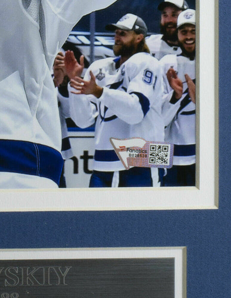 Featured is an Andrei Vasilevskiy Tampa Bay Lightning signed framed 8x10 Stanley Cup hockey photo. This photo was hand signed by Andrei Vasilevskiy and authenticated by Fanatics authentication services. Included with the photo is a Fanatics hologram and certificate of authentication. Brand new professional framing featuring double matting and an engraved nameplate. The frame measures approximately 11x14 in total size and it is ready for display. This photo would make a great addition to any sports memorabilia collection.. SPECIFICATIONS Autographed By: Andre Vasilevskiy Team: Tampa Bay Lightning Sport: Hockey-NHL Authentication: Fanatics Authentic
