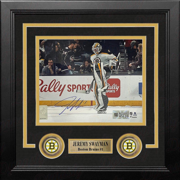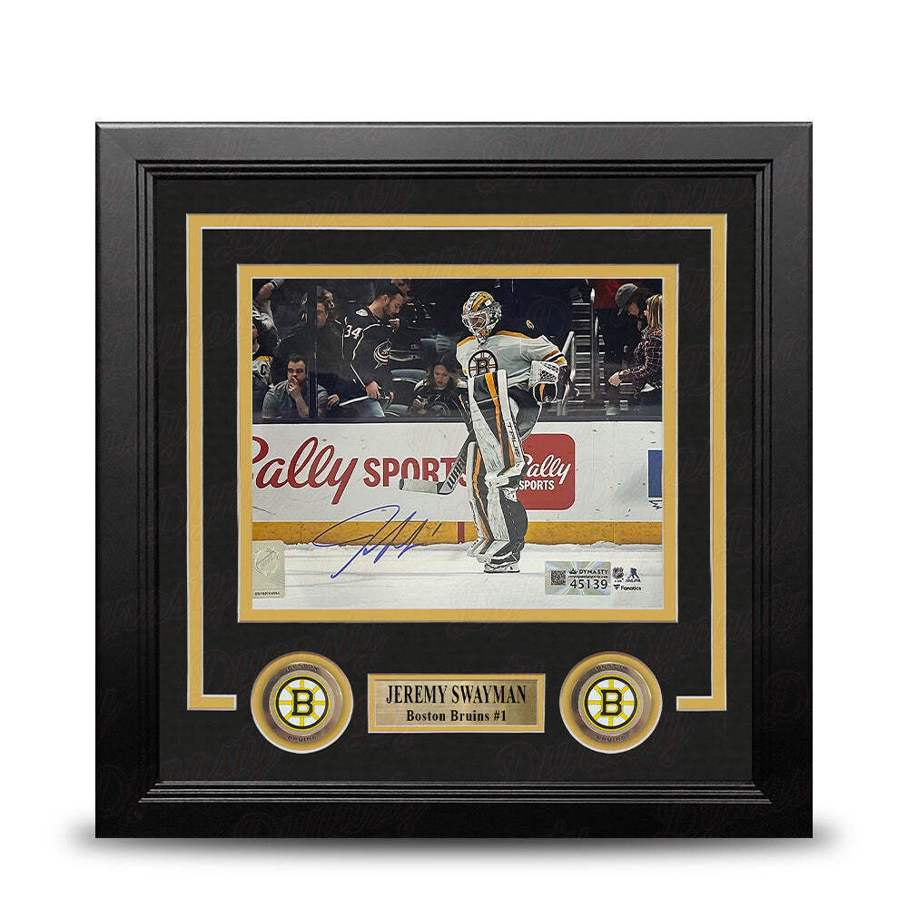 Jeremy Swayman Warming Up Boston Bruins Autographed 8" x 10" Framed Hockey Photo Signed picture of Bruins star goalie Jeremy Swayman; authenticated by Dynasty Sports during public autograph appearance This officially licensed photo has been signed by Boston Bruins star goalie Jeremy Swayman. It has been authenticated by Dynasty Sports during a public autograph experience on August 10, 2024. Hand-signed by Boston Bruins star goalie Jeremy Swayman Signature is bold and clear on the photo Authenticated by Dynasty Sports from public autograph event Framing is professional quality Framed 8" x 10" measures 13" x 16" Click here to purchase the the autographed photo only Custom framing options available - contact our storefront for information regarding customizing this in the frame and matting colors of your choice! Add a nameplate and team logo medallions! Please allow additional time for framing and shipping