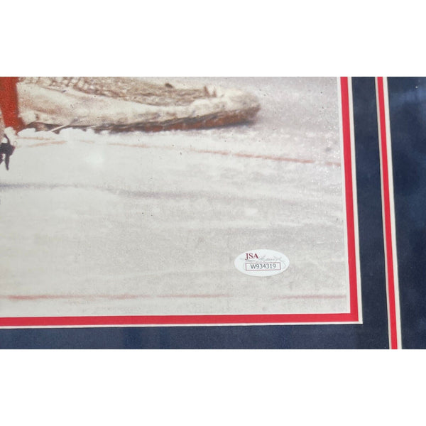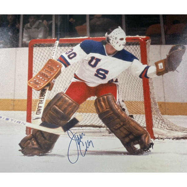 The number in the listing title is just an inventory sku for our records and is not the authentication number. The item pictured is the exact item you will receive, please see photos for condition. This is a framed photo and goalie mask that was personally autographed by Jim Craig. The frame is a shadow box with dimensions L-28 in. W-26.5 in. H-4 in. Includes a certificate of authenticity from James Spence Authentication (JSA) and Denver Autographs.