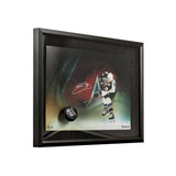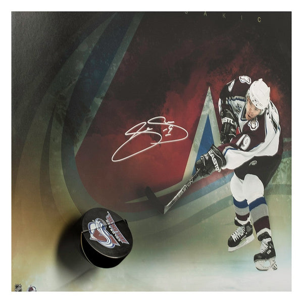 All the great ones have had that one signature move that sets them apart from all others. For Joe Sakic, it was his wrist shot. The image of a streaking Sakic delivering a lightning-quick wrist shot struck fear in the hearts of many a goaltender over his 20-year career. He would have led the league in "frozen goaltenders" if there was such a stat. Quick and deadly accurate, his wrist shot accounted for a great deal of his 709 career goals, including an epic shot over Martin Brodeur's glove in Game 7 of the 2001 Stanley Cup championship that gave the Avalanche their second title. This framed piece gives you that feeling of being a goaltender frozen as a Colorado Avalanche souvenir puck is physically breaking through the Plexiglas, coming at you in true 3-D. Sakic has signed this limited edition (25) Avalanche Slap Shot Breaking Through 24" x 16" image in black paint pen. His signature is deemed authentic by virtue of Upper Deck Authenticated's Five Step Process.