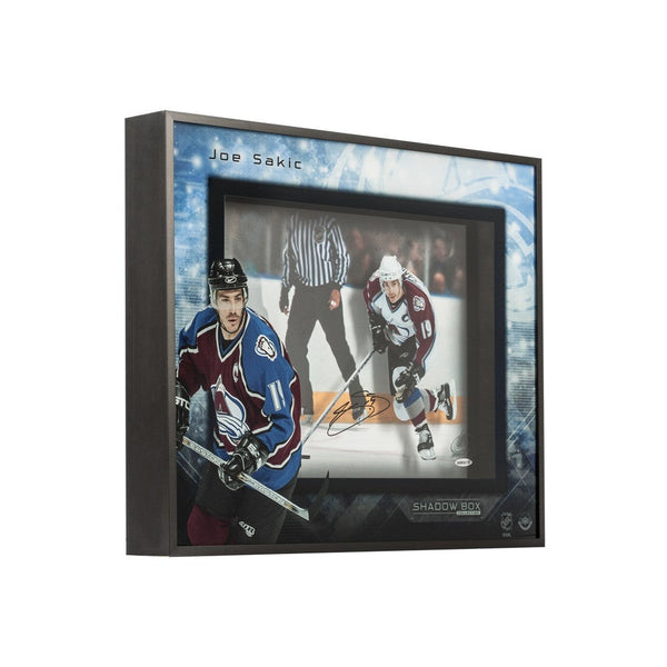 Hall of Fame athletes are consistent. They don't get spooked by pressure situations. They play the game at an elevated level no matter the circumstances. And they are equally outstanding on the road as they are in front of their home crowd. Throughout his 20-year career, Joe Sakic was the model of consistent excellence. He was the face of the franchise in Quebec and made that seamless transition as team captain when the club moved to Colorado in 1995. In his career, he played in 702 games on home ice and 26 fewer games on the road. He averaged 0.467 goals per game at home and 0.439 on the road. He scored 100 power-play goals at home, 105 on the road. The captain scored 16 short-handed goals at home and an equal amount on the road. He was a picture of consistency. Sakic has signed this limited edition (25) Captain Avalanche Shadow Box in black paint pen. The outer acrylic layer features an image of Sakic in a burgundy home jersey while the second layer shows the captain controlling the puck down the ice in a white away jersey. Also on this second acrylic layer is Sakic's authentic autograph. The third acrylic layer features Sakic's shadow and the ice rink. The three layers are encased in a 20.5" x 2.5" x 16.5" black metal frame for a true 3-D effect. The unique three-layer piece is designed in the same fashion as the Shadow Box trading cards first seen in Upper Deck SPx Football in 2009. His signature is deemed authentic by virtue of Upper Deck Authenticated's Five Step Process.