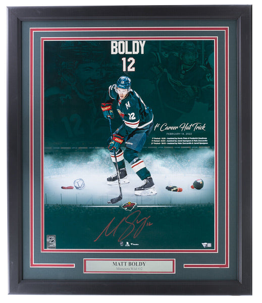 Featured is a Matt Boldy signed framed 16x20 Minnesota Wild photo. This photo was hand signed by Matt Boldy and has been authenticated by Fanatics authentication services. Included with the photo is a Fanatics hologram and certificate of authenticity. Brand new professional framing featuring double matting and engraved nameplate. The frame measures approximately 22x27 in total size, and it is ready for display. This item would make a great addition to any sports memorabilia collection. SPECIFICATIONS Autographed By: Matt Boldy Team: Minnesota Wild Sport: Hockey Authentication: Fanatics Authentic
