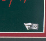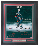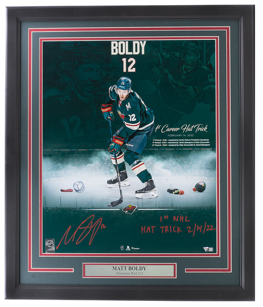 Featured is a Matt Boldy signed framed 16x20 Minnesota Wild photo in which he added the "1st Hat Trick 2/14/22 " inscription. This photo was hand signed by Matt Boldy and has been authenticated by Fanatics authentication services. Included with the photo is a Fanatics hologram and certificate of authenticity. Brand new professional framing featuring double matting and engraved nameplate. The frame measures approximately 22x27 in total size, and it is ready for display. This item would make a great addition to any sports memorabilia collection. SPECIFICATIONS Autographed By: Matt Boldy Team: Minnesota Wild Sport: Hockey Authentication: Fanatics Authentic