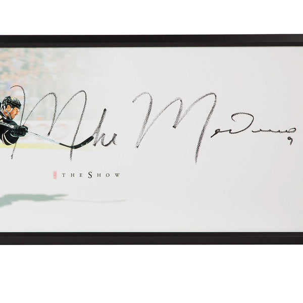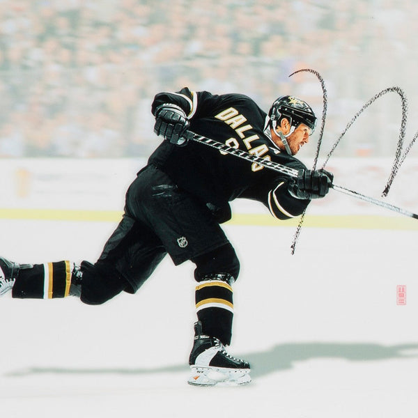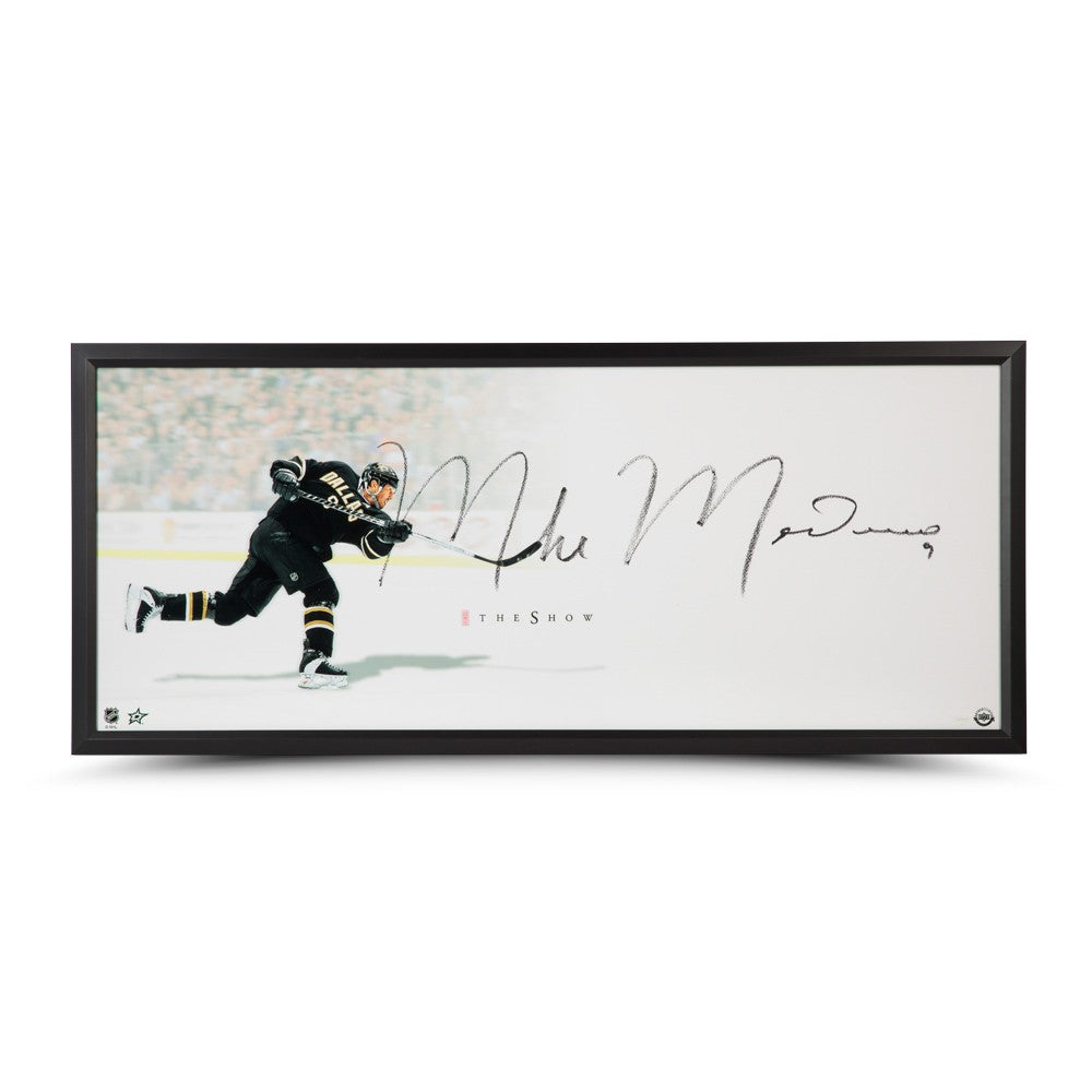 Mike Modano was four days away from his 18th birthday when the Minnesota North Stars selected him with the first overall pick in the 1988 NHL Entry Draft. Modano became the second American in NHL history to be selected first overall. Prior to the 1993-94 NHL season, the North Stars moved from Minnesota to Dallas and became what is known today as the Dallas Stars. Modano became a star in Dallas and sold the most jerseys out of any player on the team. In 2011, Modano officially retired after signing a one-day contract that allowed him to retire with the Stars. Modano has inked his largest autograph available in the market in thick black paint pen. This framed 46"x20" display is ready to hang on your wall and features an oversized autograph accompanied by a high-quality print on acrylic of an action shot from an NHL game. Modano's signature is guaranteed authentic by virtue of Upper Deck Authenticated's Five-Step Process.